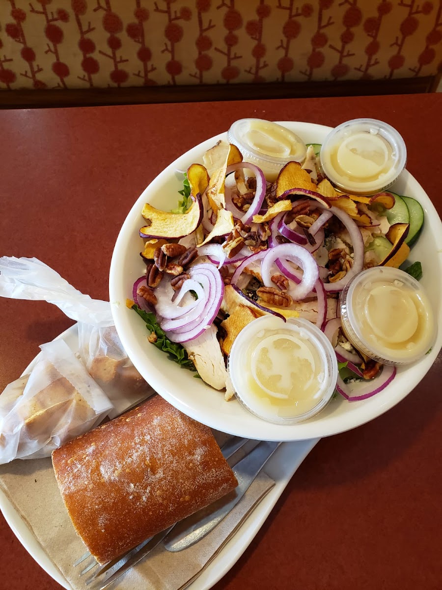 The French onion soup was so delicious and the Chai Tea Latte also good. Of course the bread was what it should be as per having the translation of breadbasket in the name. The chicken sandwiches are NOT a fully sauced covered chicken but rather a drizzle of sauce, legitimately as pictured in their menus. If your expectations are to have a form of full sauce covered chicken sandwich, this is not the place for that just a FYI. I had to ask for a table to be cleaned off for the two of us and they forgot to move the Latte to my self serve area so I could have it too. On a second visit I ordered in for two a take out from the "You Pick Two" which my wife declared as so yummy and the bread was moist. "The Spicy Take" overall was a different sammy with their pickles and it's rather expensive for a sandwich for lunch. Luckily it was my wife's gift card and she's the one who really enjoys it.